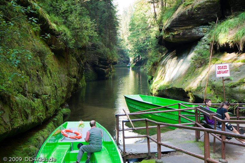 Die einfachste Variante ist der Zugang von Hrensko. Vom Parkplatz läuft man ohne wesentliche Steigung ca. eine halbe Stunde die Kamenice entlang. Nach einem Wehr geht es nun per Boot weiter. Die Boote werden gestakt, die Bootsfahrt dauert ca. 20 Minuten. Nach weiteren fünf Minuten Gehweg erreicht man ein Blockhaus als Ausflugslokal. Neben den üblichen Speisen und Getränken, kann man auch eine Wurst kaufen und am Feuer selbst grillen. Zurück geht es über den gleichen Weg.
