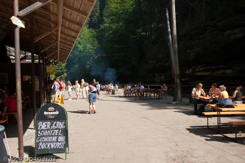 Aufgrund der Bekanntheit als Ausflugsziel und der einfachen Wegstrecke ist man natürlich nicht allein unterwegs, aber im Vergleich zu dem, was ich im Hochsommer auf der Bastei erlebt habe, war es doch noch angenehm. Wir hatten an der Bootsanlegestelle keine Wartezeiten, auch im Ausflugslokal waren noch genügend freie Sitzplätze.