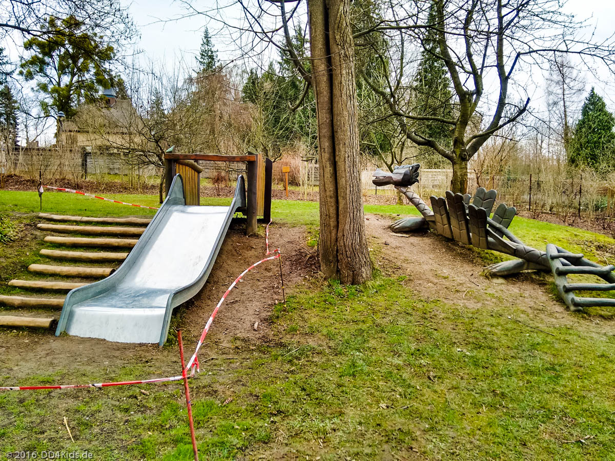 Die Korbschaukel war allerdings nicht benutzbar (Ich habe daher noch ein Bild von 2011 beigefügt). Außerdem war der Bereich um die Rutsche gerade abgesperrt, vermutlich soll hier das Gras wieder wachsen.