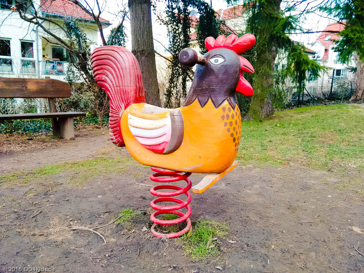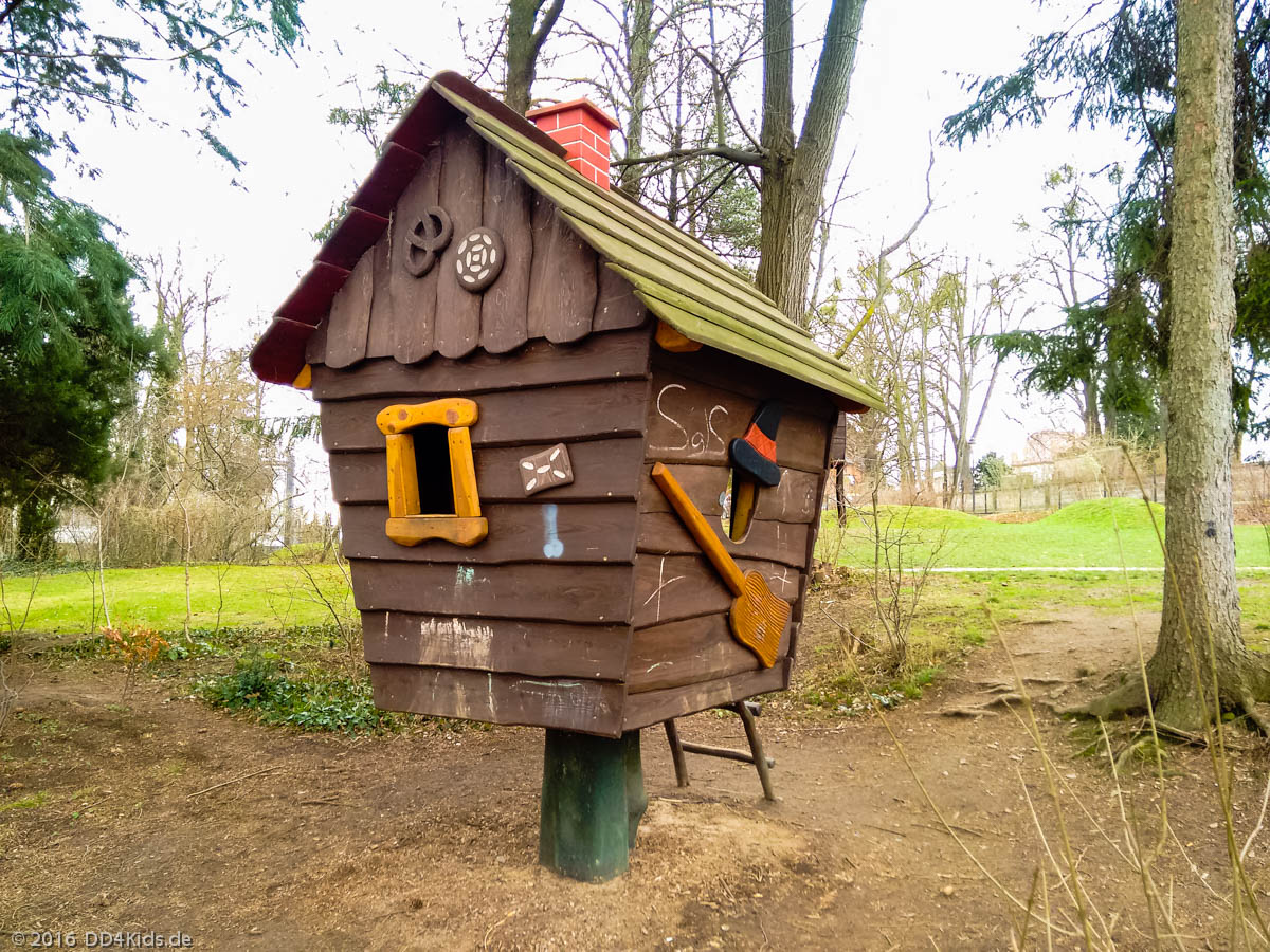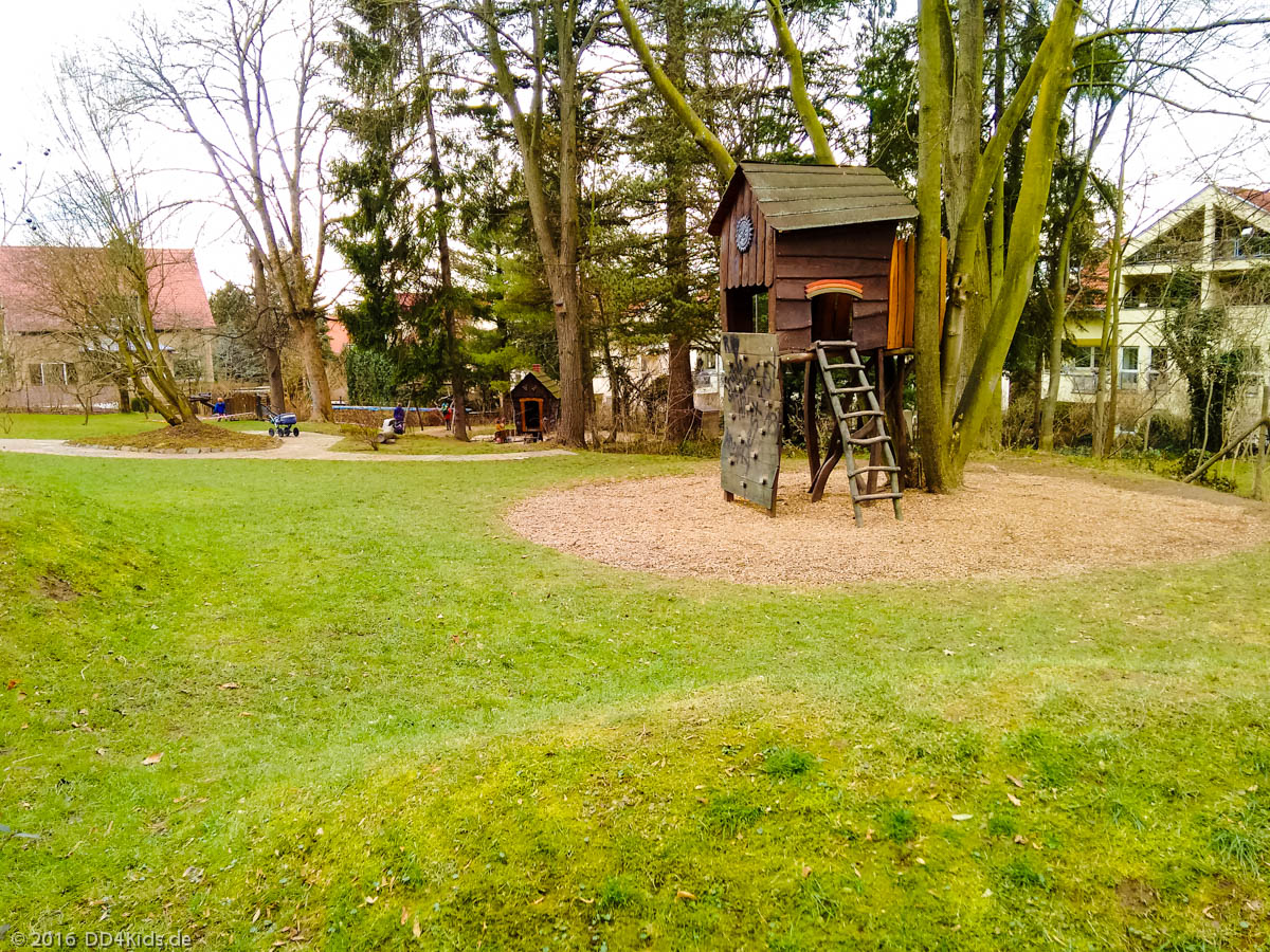 Bei den Spielplatzgeräten dominiert das Thema Märchen. So gibt es ein Spielhaus in Form einer Schatzkiste, ein Hexenhäuschen auf einem Bein, ein niedriges Drachen-Klettergerüst, eine Rutsche, eine Kleinkinderschaukel, eine Korbschaukel und ein Bauhaus für die etwas größeren Kinder. Auch ein Sandkasten und ein Federtier ist vorhanden.