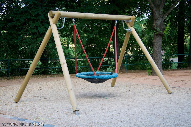 Auf dem Spielplatz gibt es eine lange Rohrrutsche, einem Klettergerüst, eine große Korbschaukel (Vogelnest), ein Karussell, zwei Wippgeräte. Alles optimal für die Alterstufe 3-7 Jahre.