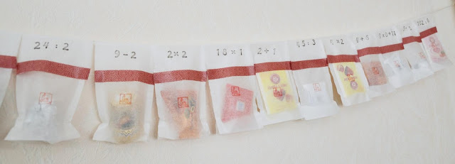 Für die Schwiegereltern haben wir gestern gemeinsam einen Adventskalender gebastelt. Aus Teefiltertüten mit Weihnachtsengelstempel, der schon letztes Jahr zum Einsatz kam, bestempelt und statt mit Zahlen mit kleinen Rechenaufgaben versehen. Der Ehemann war voll in seinem Element und nur etwas betrübt, dass er Dinge wie die Boltzmann-Konstante nicht mit den Stempeln darstellen konnte. Anschließend wurden die befüllten Tütchen einfach über eine gespannte Baumwollschnur gehangen und mit weihnachtlichem Masking Tape verschlossen.